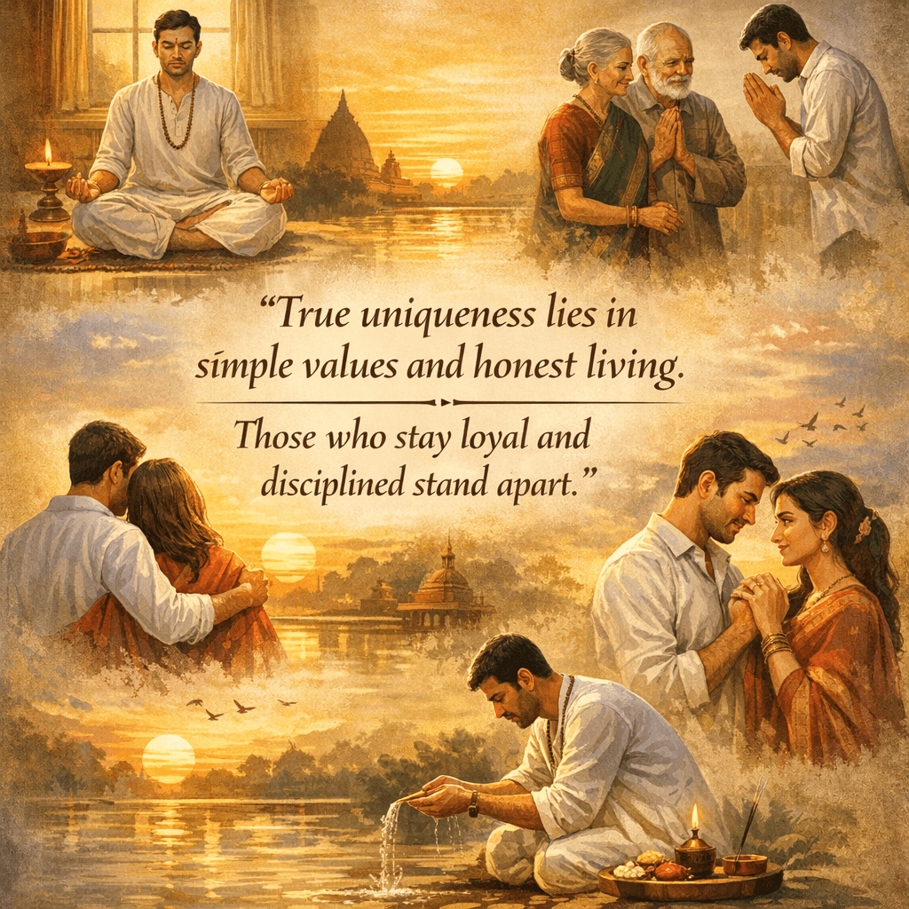 A person who wakes up early, prays, and lives a simple life stands apart. Respecting elders and understanding the feelings of parents shows strong character. Following daily prayers and doing oneโ€™s karma with honesty builds a meaningful life.